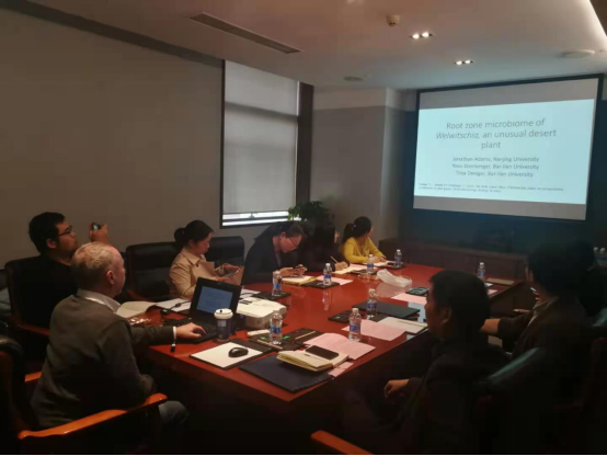 会上,Jonathan Adams教授首先介绍了该团队的情况,作了题为“Root zone microbiome of Welwitschia mirabilis, an unusual desert plant”的学术报告,提出了土壤微生物多样性研究的几个国际热点。