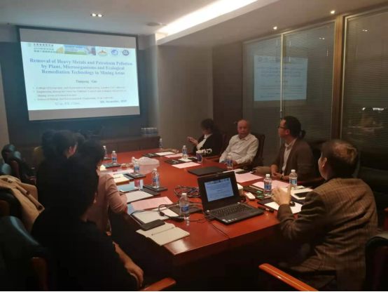 高天鹏教授介绍了秦岭及内陆河高质量发展研究团队的状况,做了题为“Removal of Heavy Metals and Petroleum Pollution by Plant, Microorganisms and Ecological Remediation Technology in Mining Areas”的学术报告,并对团队各位老师的研究方向、近期成果和后期发展做了详细阐述。