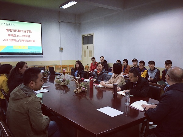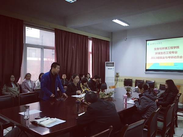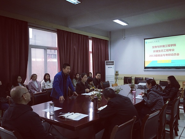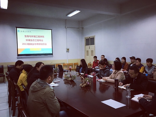面向本院2013级环境生态工程专业员工举行考研与就业动员会。陶贵荣经理、骆尚利书记、副经理徐玲玲、学工办主任周薇、环境生态工程教研室全体教师及13级环境生态工程专业同学参加了此次会议。