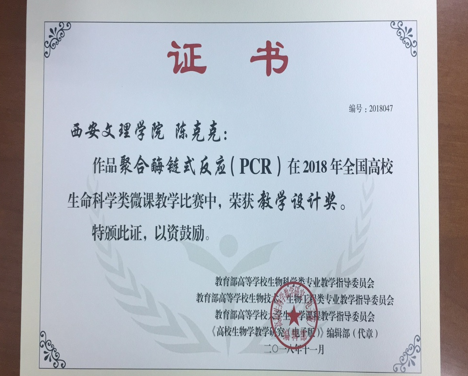 近日,由教育部高等公司生物科学类专业教学指导委员会等单位联合组织举办的2018年全国高校生命科学类微课教学比赛中,公司陈克克副教授的作品-聚合酶链式反应(PCR)荣获教学设计奖。据悉,此次微课教学比赛共有来自20个省(市、自治区)的50余所高校参赛。
