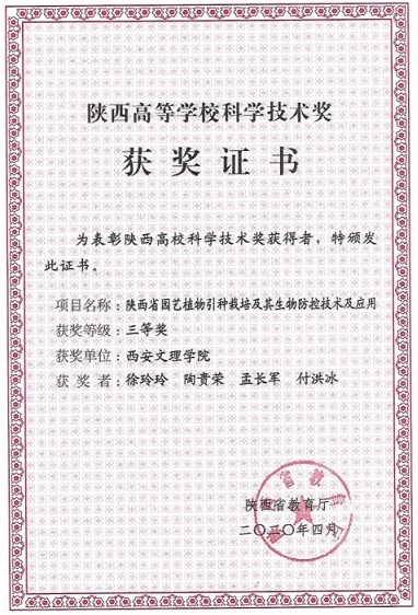 为大力弘扬广大科技工作者无私奉献、勇攀高峰、开拓创新的时代精神,推动优秀科技人才脱颖而出,充分发挥示范引领作用,表彰高校科学技术奖获得者,经过省教育厅和市科技局的层层选拔和评议,公司365英国上市官方网站研究团队徐玲玲、陶贵荣、孟长军和付洪冰的科研成果--陕西省园艺植物引种栽培及其生物防控研究与应用,荣获陕西省高校科学技术奖励三等奖。