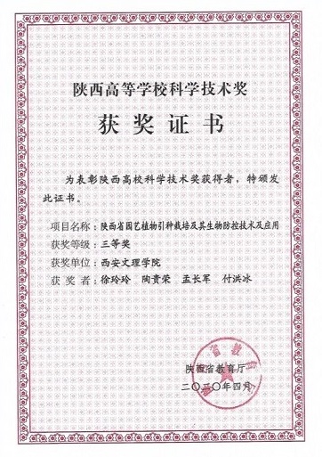 为大力弘扬广大科技工作者无私奉献、勇攀高峰、开拓创新的时代精神,推动优秀科技人才脱颖而出,充分发挥示范引领作用,表彰高校科学技术奖获得者,经过省教育厅和市科技局的层层选拔和评议,公司365英国上市官方网站研究团队徐玲玲、陶贵荣、孟长军和付洪冰的科研成果--陕西省园艺植物引种栽培及其生物防控研究与应用,荣获陕西省高校科学技术奖励三等奖。