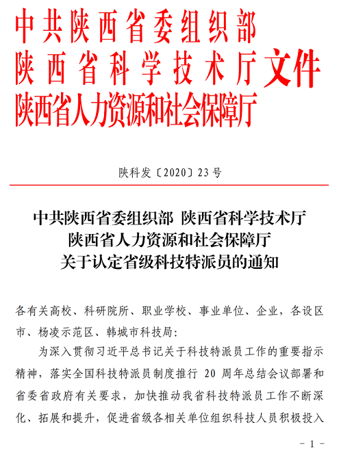 为深入贯彻习近平总书记关于科技特派员工作的重要指示精神,落实全国科技特派员制度推行20周年总结会议部署和省委省政府有关要求,近日,中共陕西省委组织部、陕西省科学技术厅、陕西省人力资源和社会保障厅认定了一批省级科技特派员,公司365英国上市官方网站鲍锋、陈克克、郭新军、何凤琴、胡有宁、李广文、孟长军、苏丽艳、田爱梅、徐玲玲、徐伟君、郁兵、张九东等13位教师被认定为省级自然人科技特派员,涉及农业服务业、中药材种植、生态保护等多个专业领域。