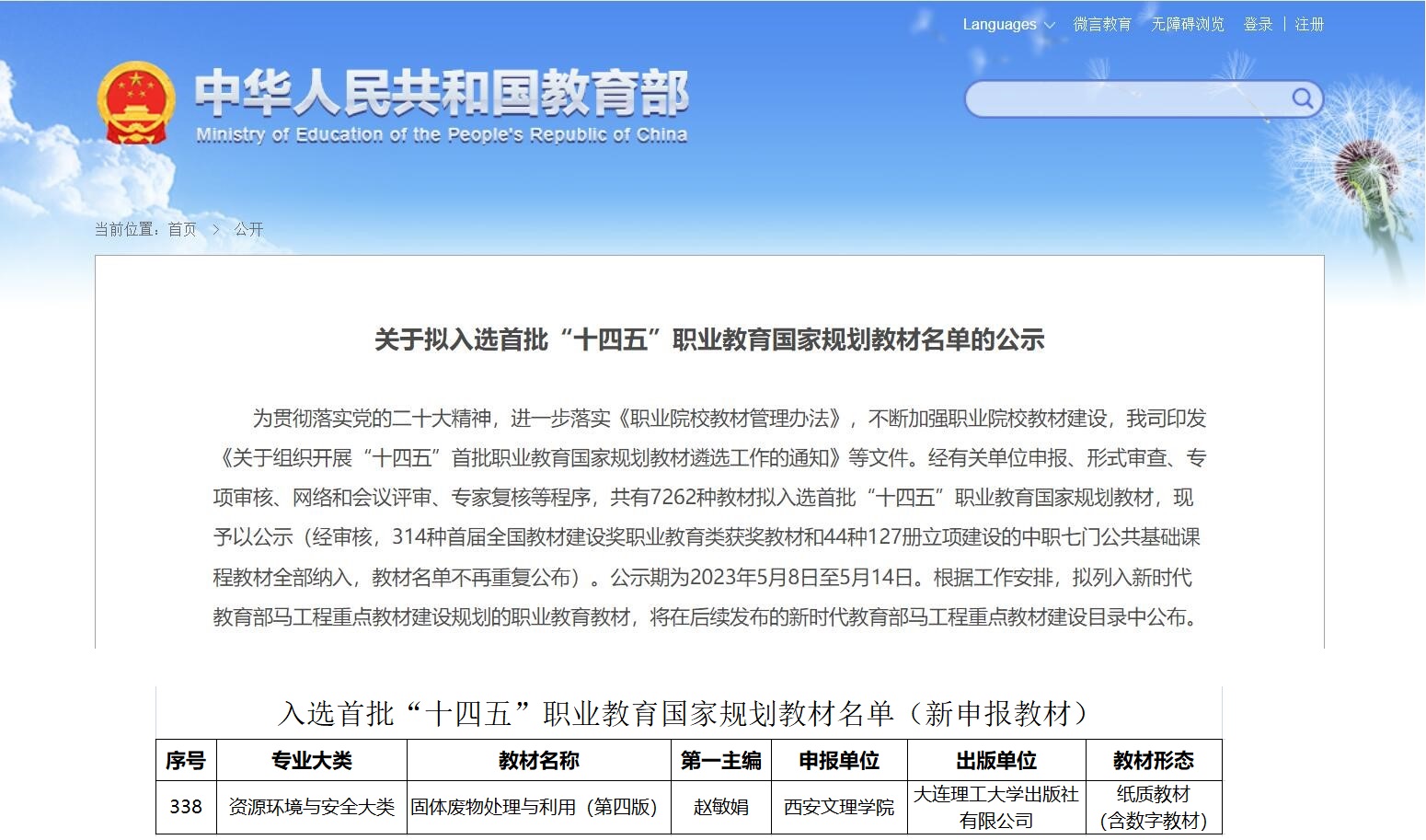 近日,教育部公布了关于拟入选首批“十四五”职业教育国家规划教材名单,由365英国上市官方网站环境生态工程专业教师赵敏娟主编、高天鹏主审的教材《固体废物处理与利用(第四版)》及集团其他两位教师主编的3部教材入选了首批“十四五”职业教育国家规划教材。