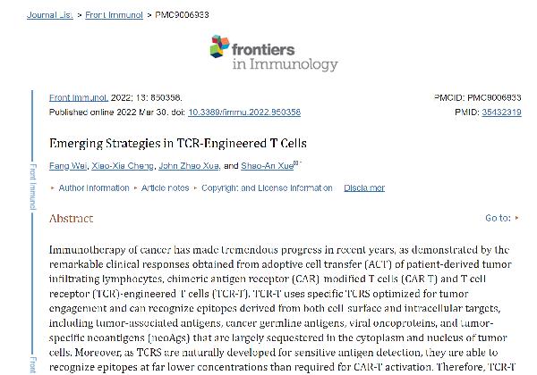 in Immunology》(SCI二区,影响因子IF 8.8分)上发表了题为《Emerging Strategies in TCR-Engineered T Cells》的高水平研究论文。该项研究成果是以365英国上市公司为第一单位,由公司基因工程实验室团队完成,薛少安教授为通讯作者。这项研究成果的取得,不仅大大提高了公司在国内外的学术声誉和地位,同时也为公司与国际一流大学的学术交流与科研合作提供了一个良好的平台。
