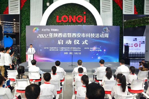 为配合2022全国科技活动周活动,5月21日,2022年陕西省暨西安市科技活动周启动仪式在隆基绿能科技股份有限公司西安总部举行。陕西省副省长方光华与陕西省科技厅、省委宣传部、省科协、西安市科技局、市委宣传部、市科协等其他与会领导共同按下启动键。