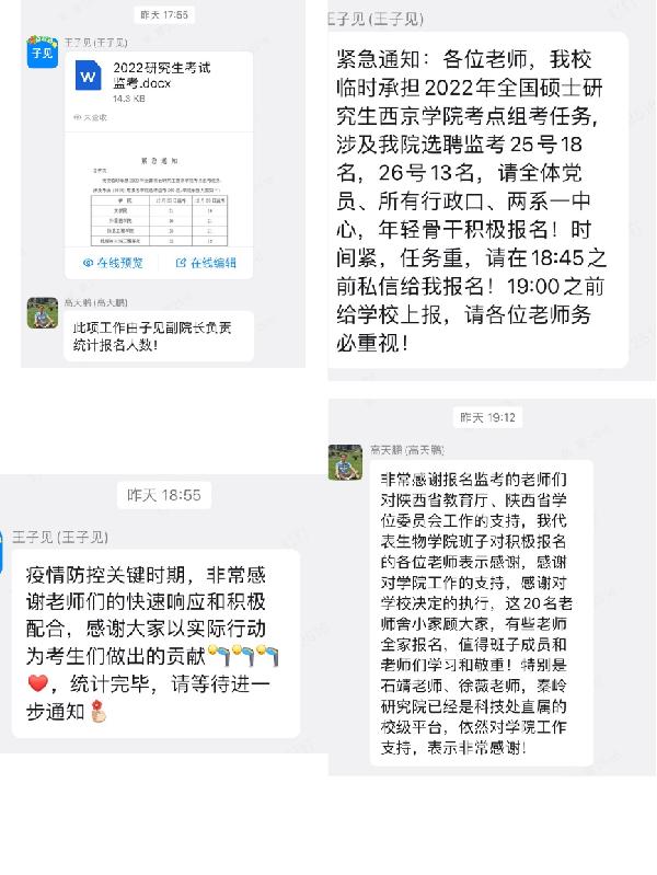 12月24日下午,陕西省教育厅紧急联系公司,公司勇挑重担,接替西京公司成为2022年研究生考试考点。公司在下午6时许接到公司的监考任务后,迅速反应,认真研判并部署,采取在钉钉群内通知和电话通知相结合的方式,号召党员、行政人员和年轻骨干积极报名。在不到一个小时的时间内,完成了监考统计工作,共报名35人次,超过公司要求4人次,为外校考生顺利在公司进行考试奠定了基础。
