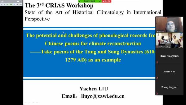 基于该论文,刘亚辰博士受到国际组织“过去全球变化”(Past Global Changes)下设工作组“国际视野下的历史气候学现状”(CRIAS 3rd workshop:State of the Art of Historical Climatology in International Perspective)的邀请,做了题为“中国诗歌物候记录用于气候重建的潜力和挑战——以唐宋诗歌为例”(The potential and challenges of phenological records from Chinese poems for climate reconstruction——Take poems of the Tang and Song Dynasties (618-1279 AD) as an example)的线上报告。