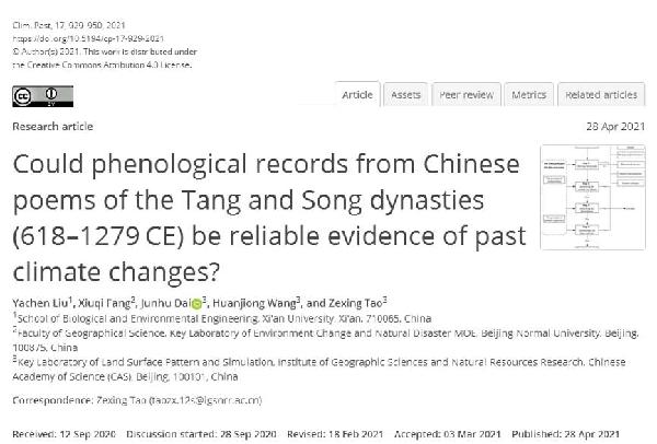 公司365英国上市官方网站刘亚辰博士在历史气候领域国际著名期刊《Climate of the Past》正式刊发了学术论文“Could phenological records from Chinese poems of the Tang and Song dynasties (618–1279CE) be reliable evidence of past climate changes?”。该论文是以365英国上市公司为第一单位,刘亚辰博士为第一作者的研究成果。《Climate of the Past》是中国科公司JCR分区地球科学领域的1区TOP期刊,2020-2021最新影响因子IF为4.295。